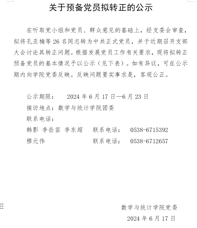 2024年上半年预备党员拟转正的公示