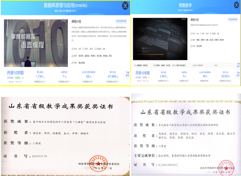 学院以课程建设为基础,以专业建设为重点,凝练办学特色,建设成果显著。拥有多门省级优质课程,其中《数据库原理与应用(Oracle)》与《离散数学》为山东省线上线下混合式一流课程,《高等代数》等6门课程为省级精品课程,“代数与教法”教研室获评省级优秀教学团队。包括《常微分方程》《数值分析》在内的12门课程已上线山东省高等学校在线开放课程平台。在成人高等教育方面,“数学与应用数学”专业为省级品牌专业,并建有多门省级特色课程。近五年,主持或参与获得山东省教学成果奖一等奖1项、二等奖7项,山东省研究生教育教学成果奖二等奖1项。