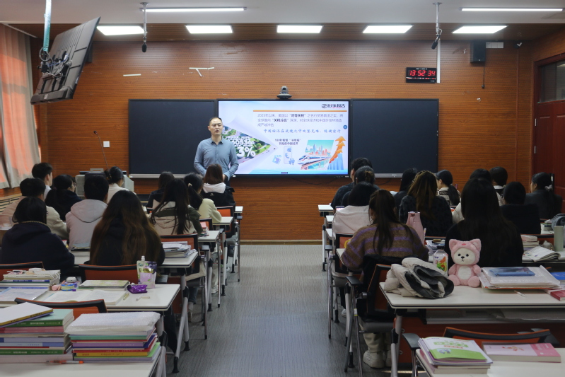 围绕青年一代的成长路径,姜山提出三点期望:一要关注时政、增强自信,从国家发展进程中找准时代方向;二要学习科技工作者与体育健儿的拼搏精神,立足专业、锤炼本领;三要把握经贸发展与产业变革机遇,将个人理想融入国家建设,在实干中书写青春价值。授课过程中,姜山与学生积极互动,答疑解惑,课堂氛围热烈。