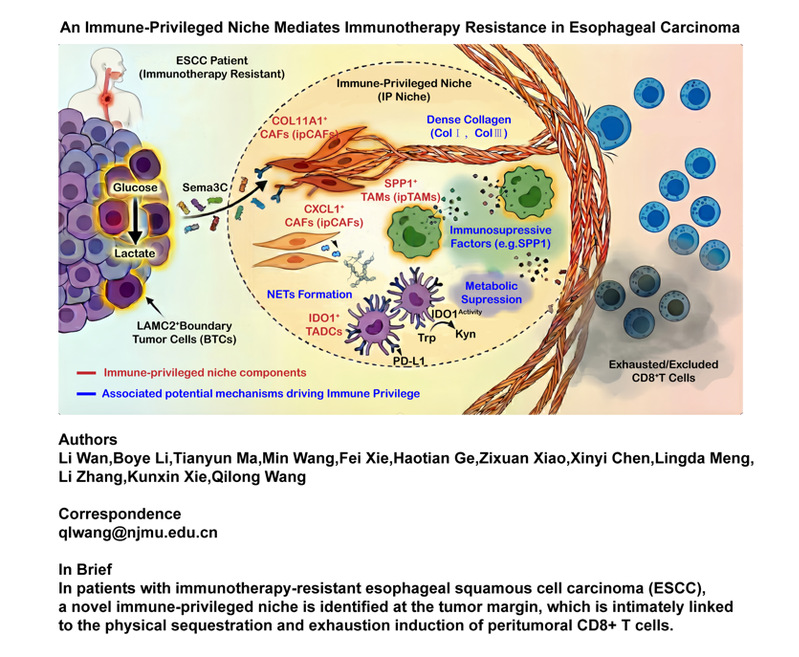 本研究揭示了一种定位于肿瘤边界、决定食管鳞癌免疫治疗疗效的“免疫豁免生态位”。李勃晔博士指导学院本科生团队肖紫煊、陈欣怡、孟令达,通过开发应用于基因测算的深度学习算法,成功从计算层面识别出该关键生态位。本科生团队在本项突破性发现中承担了核心计算工作,为学校践行“以高水平科研反哺创新人才培养”的理念提供了典型范例。