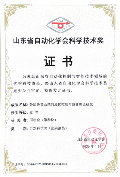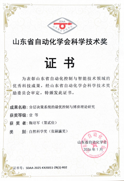 近日,山东省自动化学会2025年度科学技术奖获奖名单正式发布。我校李小倩博士、鞠培军教授、国忠金教授申报的《分层决策系统的最优控制与博弈理论研究》项目获评自然科学(张嗣瀛奖)一等奖。