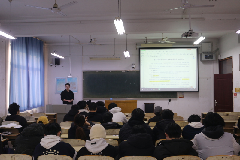 会上,楚明辉对照《泰山学院学生学业警示实施办法》,结合近年典型案例,逐条解读了学业警示的触发条件、帮扶机制,明确政策要求。他还围绕毕业资格审核关键指标,深入剖析挂科对学生学分认定、评优评先、学位授予及未来就业升学的连锁影响,引导学生深刻认识学业问题的严肃性与紧迫性。
